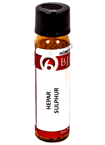 Bjain Hepar Sulphur Globules is helpful against glandular inflammation and eruptions. It relieves bleeding from the mouth and is effective against mouth and gum pains. It helps in reducing painful neck swelling and burning itching sensation in the body. The medicine also treats cold, cough, sore throat and swollen lymphatic glands.
