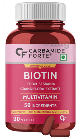 Carbamide Forte Biotin 10,000mcg + Multivitamin + Keratin + Amino Acids + Natural Extracts + Minerals Vegetarian Vegetarian Tablet are high potency biotin capsules for hair growth for women and men. It contains multivitamins which helps support faster hair growth, increases hair volume and makes hair stronger from the roots. This biotin capsule is complete hair and skin supplement with multivitamins and minerals that give you a 2 in 1 advantage that helps boost energy, immunity and vitality.It has keratin which helps reduce dryness of hair and helps repair hair damage. It also improves the elasticity of hair and helps reduce split ends. While amino acids help in keratin production, hyaluronic acid helps to grow your hair thicker.It also has bamboo extract, aloe vera, neem extract, vitamin A, C, and E, promoting and maintaining healthy skin tissue by giving it a glow. Biotin and keratin also help strengthen the nail cuticles, help prevent breakage leading to less brittle nails.