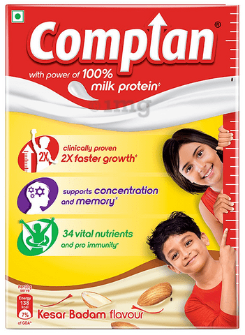 Complan Nutrition and Health Drink Kesar Badam is a scientifically designed nutrition and health drink with a clinically proven formula to give children 2x faster growth and support their memory and concentration. It is one of the best health drinks for child growth as it contains 34 vital nutrients including the power of 100% milk protein. Complan can make delicious nutrition shake for kids as it is rich in nutrients. It has iron, iodine, vitamin B12 which supports brain development and functioning as well as vitamin A, E, and C which supports immunity. Give Complan to your children two times a day as a part of their daily balanced diet and help them grow 2x faster and support their memory and concentration. Refer pack for more details.Key Ingredients
