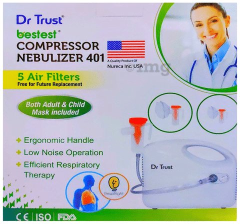 Dr Trust USA Bestest Compressor Nebulizer 401 Machine Kit helps to treat the cause of the respiratory problems efficiently. It has been known effective for cough, wheezing, asthma, COPD, bronchitis and other conditions that require nebulization. It is safe and easy to clean. It is atomized into 5 particles faster, reaching the respiratory tract more effectively. The box includes- Complete Gray Nebulizer Kit (Air Tube, Child And Adult Masks, Medicine Chamber/Nebulizer Cup, Mouthpiece, Guidebook And Extra Air Filters) Medicine is not included with the nebulizer. Please consult your doctor for the medicine to add to the nebulizer or to only use with saline water.Uses
