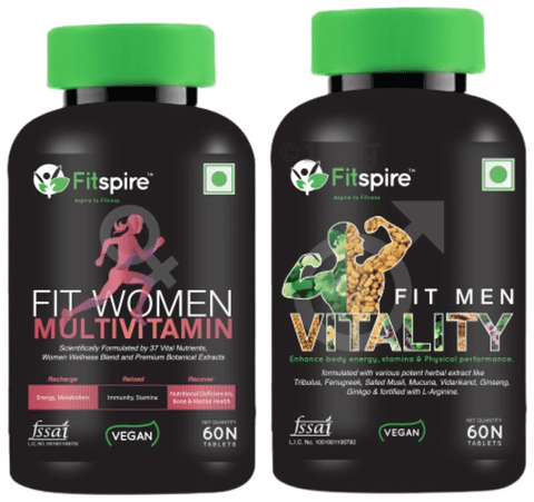 Fitspire Combo Pack of Fit Women Multivitamin Tablet and Fit Men Vitality Tablet (60 Each) provides complete care for both men and women. Fitspire Fit Women Multivitamin Tablet is scientifically formulated with 37 vital nutrients, women wellness blend and premium botanical extracts. Fitspire Fit Men Vitality Tablet is specially formulated for men. It contains various potent herbal extracts that enhance energy, stamina and physical performance.