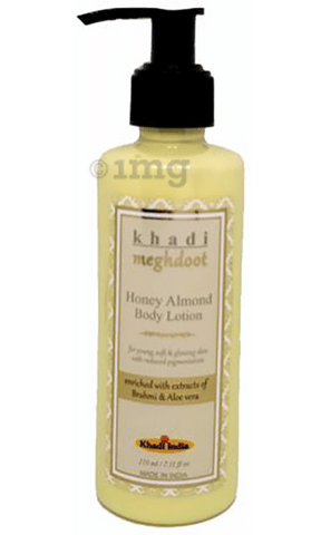 https Khadi Meghdoot Body Lotion Honey Almond is enriched with honey, aloe vera and oil extracts of almond that helps attain young soft and glowing skin by reducing skin pigmentation and wrinkles. It also helps reduce excessive dry skin.