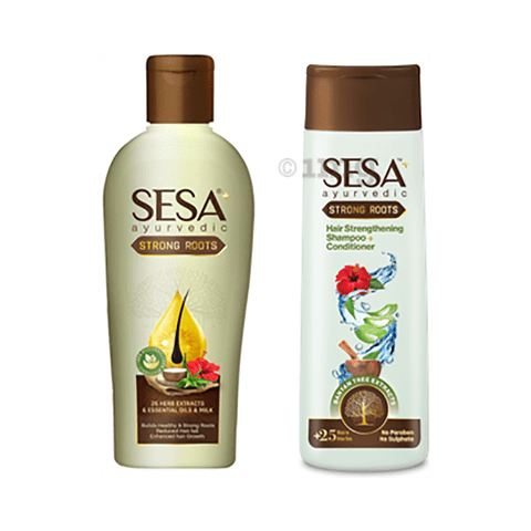 https Sesa Combo Pack of Ayurvedic Strong Roots Hair Oil 110ml & Strong Roots Hair Strengthening Shampoo+Conditioner 200ml is made up of ingredients known to help reduce hair fall in a gentle cleansing way. The product helps to control and prevent hair fall. It can be used regularly to keep hair healthy, lustrous, and shiny all day long.