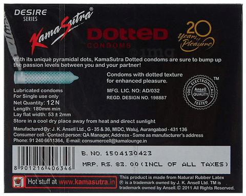 Kamasutra Dotted Condom (Raymond Consumer Care Pvt Ltd)Kamasutra Dotted Condom is a lubricated condom with ends made from premium rubber latex. The specially designed raised dots are placed strategically to give the extra added pleasure. It gives greater stimulations and sensation from the partner which evokes a deeper sexual response. It increases the level of pleasure and gives greater satisfaction to both the partners.Uses