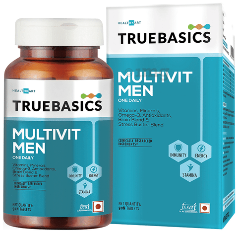 TrueBasics Multivit Men Multivitamins & Multiminerals Tablet is an amalgamation of various ingredients that work together to help support and maintain an active lifestyle by aiding the process of muscle recovery after performing rigorous exercise and help in gaining weight.