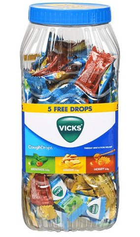 Vicks Cough Drops contain Karpoor, Pudinah Ke Phool, Nilgiri Tel, Ajwain Ke Phool, and Flavoured Sugar as active ingredients. It acts as a cough suppressant and comes in ginger, honey and menthol flavors.Key benefits/uses of Vicks Cough Drops