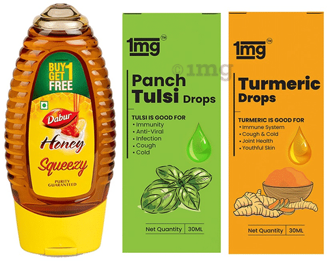 Warm Milk Mix Recipe of 1mg Turmeric Drops with Piperine 30ml, 1mg Panch Tulsi Drops 30ml and Dabur Honey Squeezy Buy 1 Get 1 Free 225gm